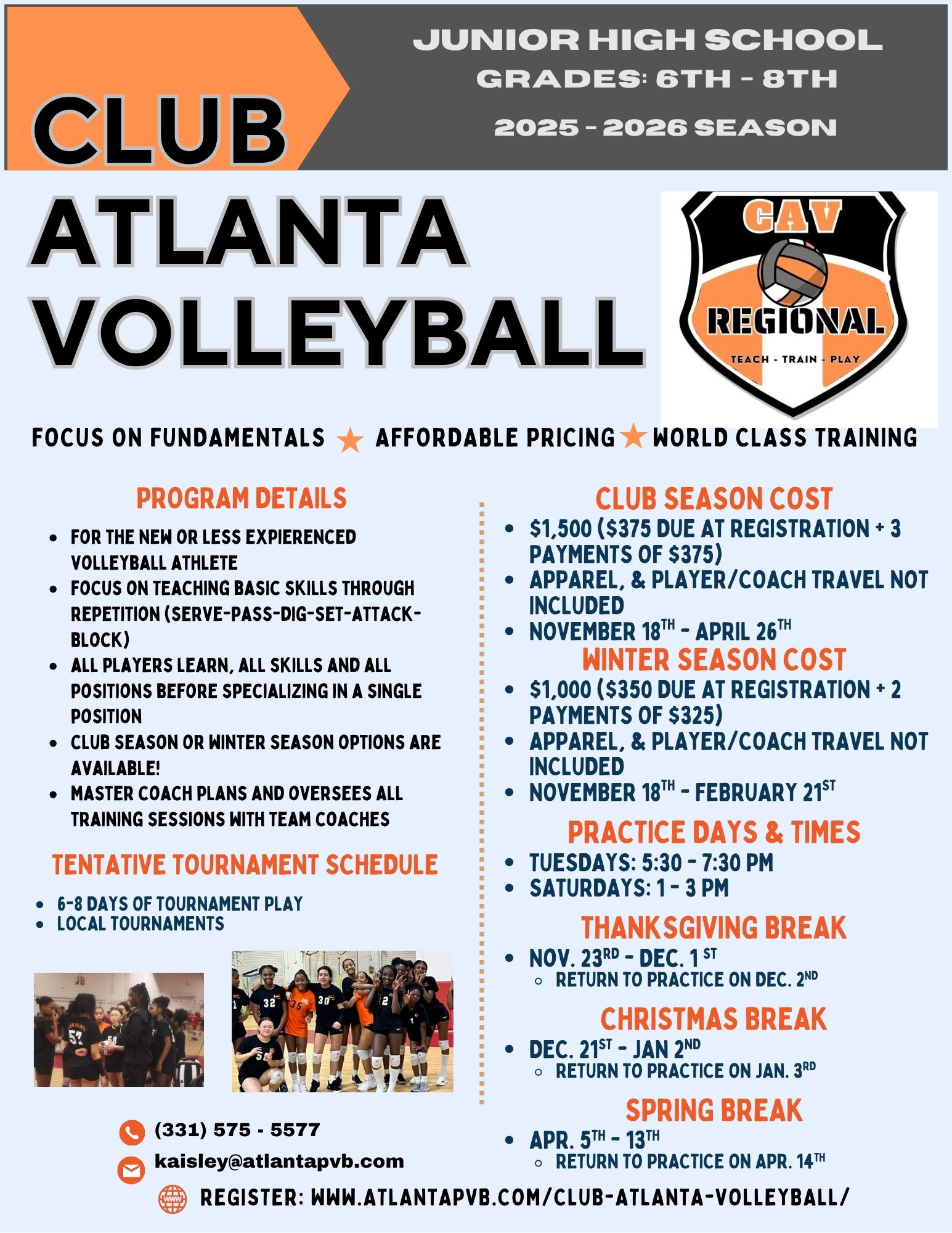The Club Atlanta Volleyball program is a great fit for 6th–8th graders who are just starting volleyball or want to be part of a team. Players will learn the basics, improve their skills, and play together in local tournaments. It’s a fun way to try the sport, make friends, and experience real game action without a huge time or travel commitment. Come join us. The season starts Tuesday, November 18th!