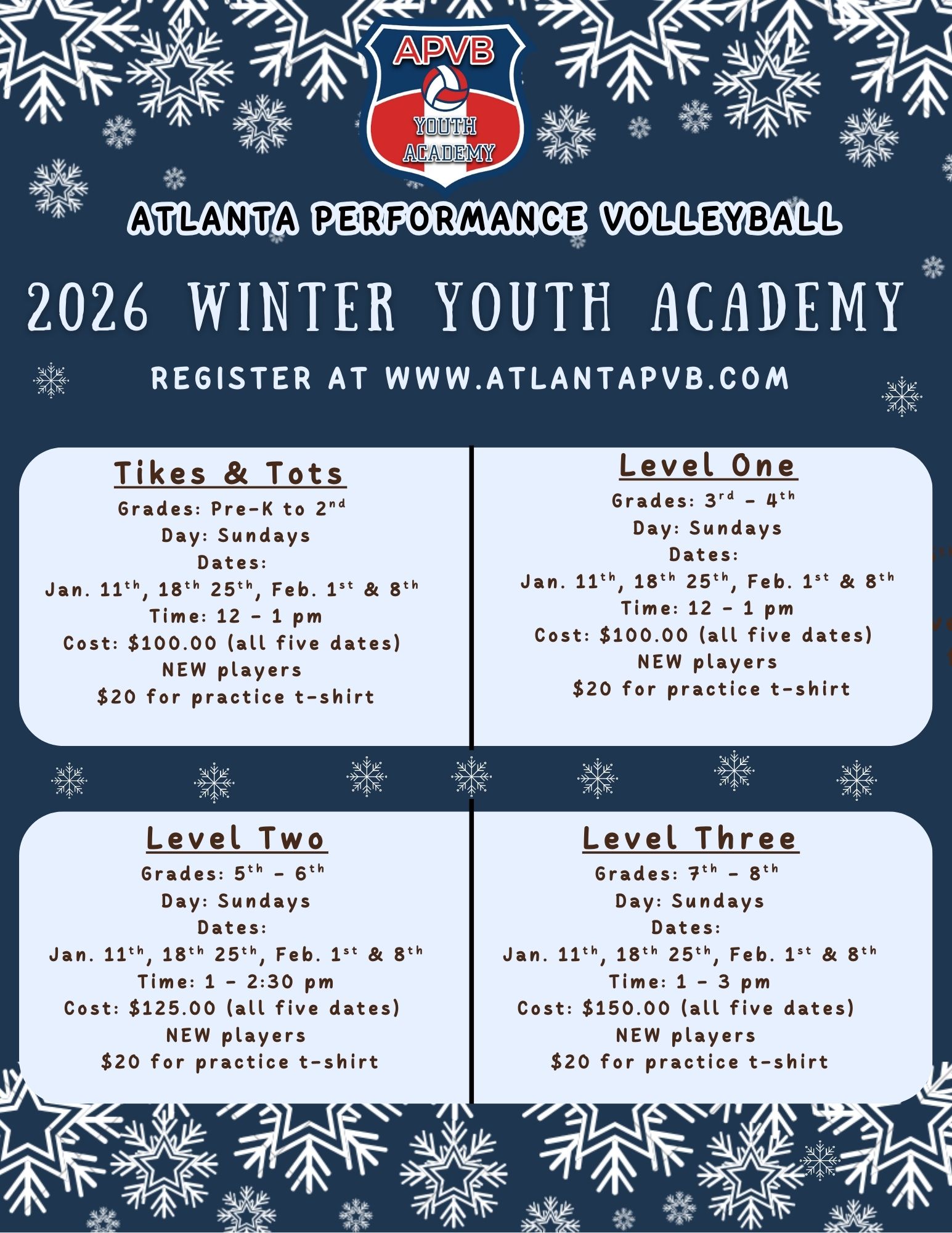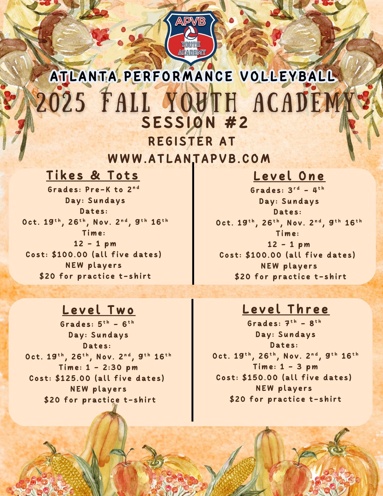 From our Club Volleyball Director, Cheryl Butler Youth Academy The Atlanta Performance Youth Academy is for those in pre-kindergarten through 8th grade. At the APVB Youth Academy, you get excellent training, skill and motor skills development, and lots of fun!! Click HERE to Register